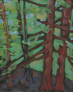 Cedars from the Deck 8 x 10″ acrylic on canvas SOLD My Great-Grandfather settled a little fruit orchard on the East Shore of Kootenay Lake in 1908. That makes my kids 5th Generation Canadians, and 4th Generation Kootenay residents. I’ve always felt rooted in this area, and each year a significant part of our vacation is spent at the small cabin my Grandfather keeps in Gray Creek. I decided to try to capture some of the scenes that I grew up with there.